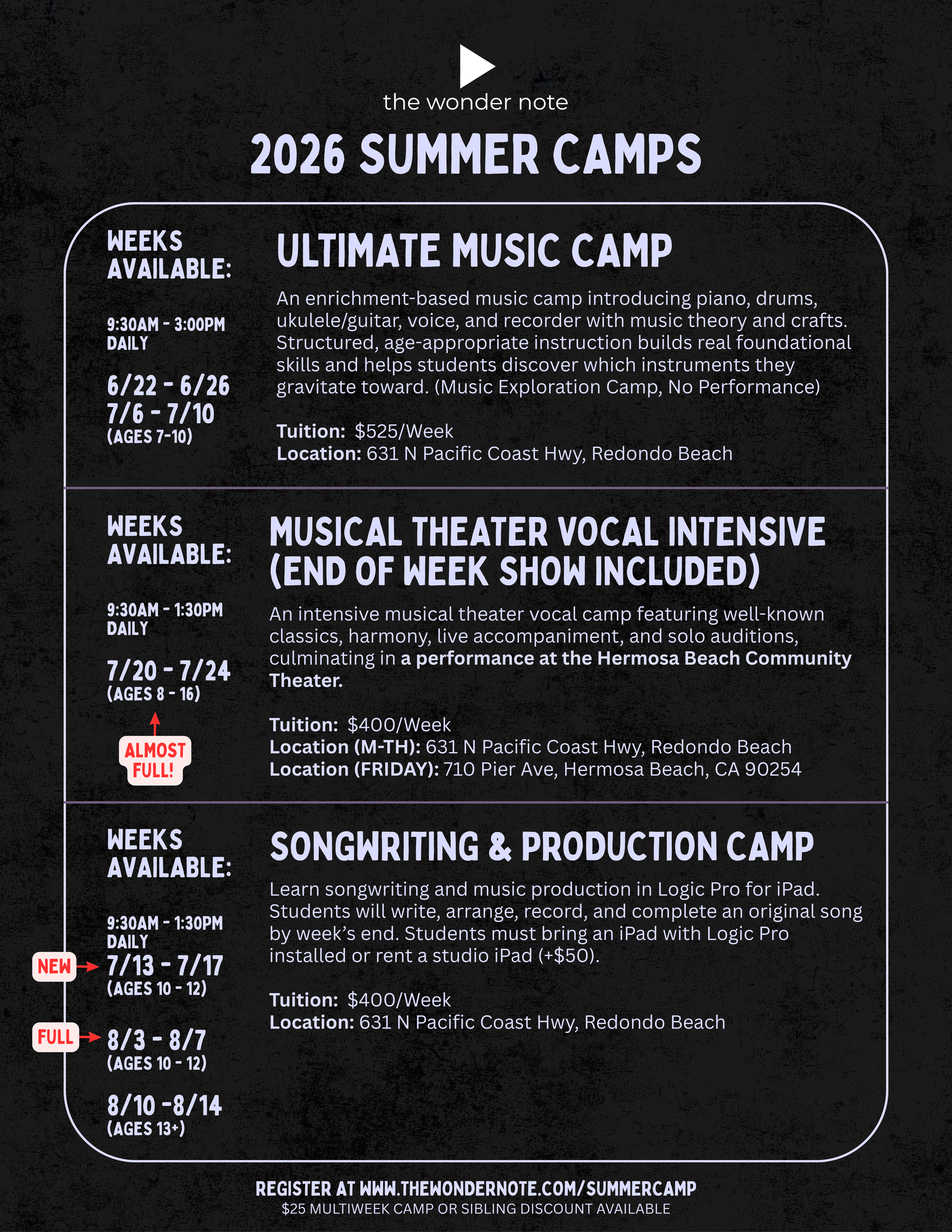 ** Unfortunately, our Ultimate Music Camp, originally scheduled for the week of July 13–17, has been canceled and replaced with a Songwriting and Production Camp in response to high demand.